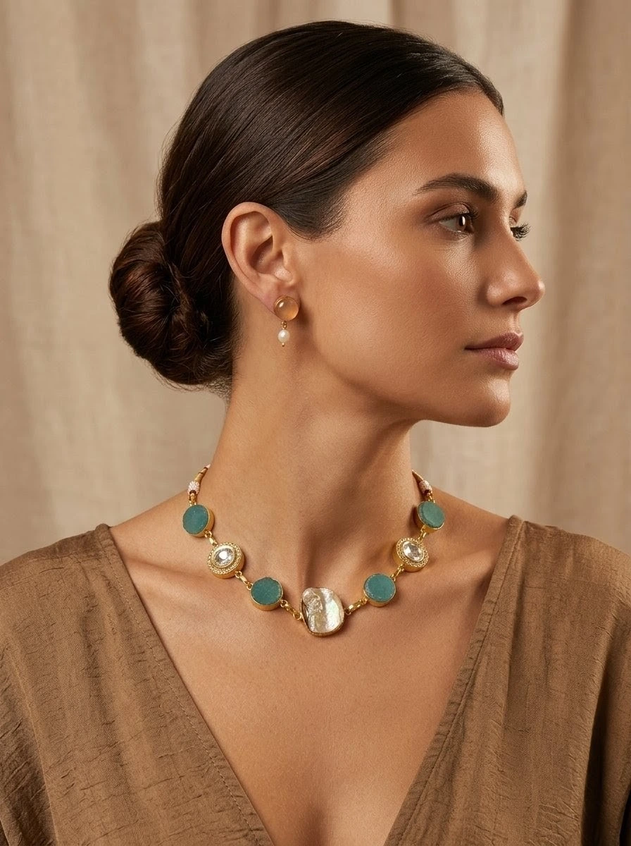 A striking blend of Mother of pearl , green druzy, and shimmering zircon accents, paired with matching earrings.