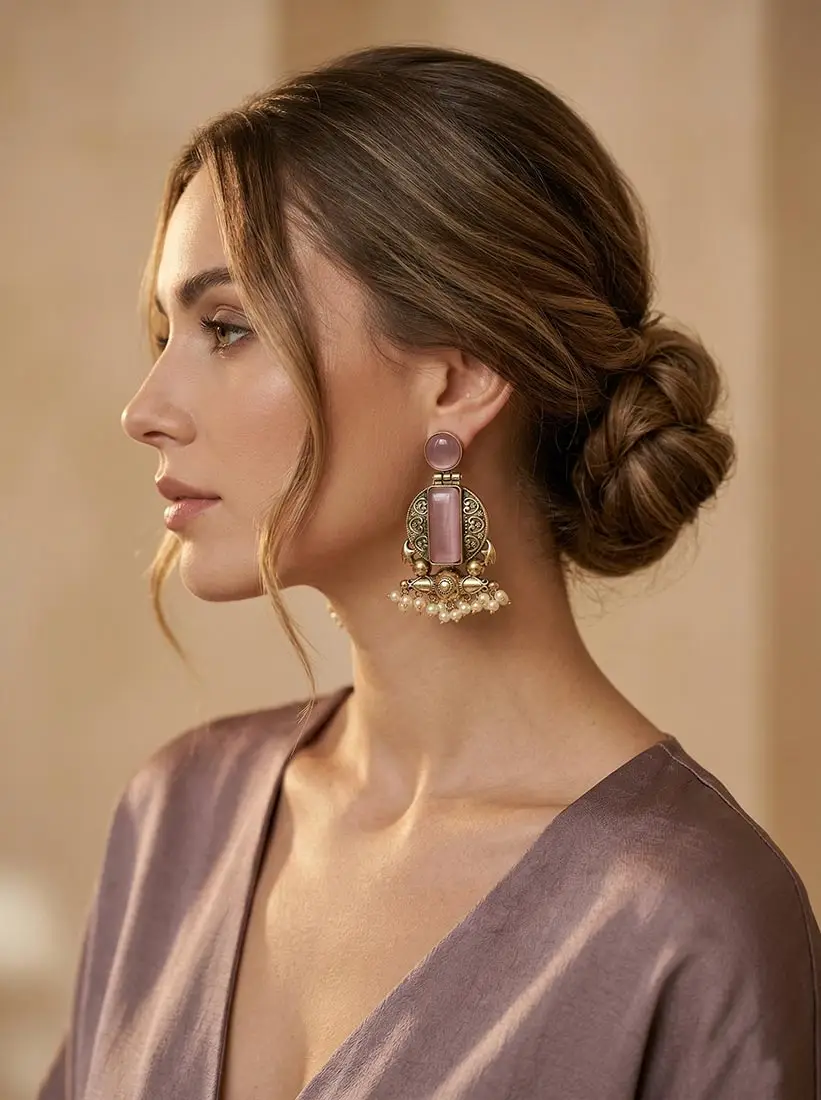 Antique gold earrings with blush pink Monalisa stones and pearl danglings.