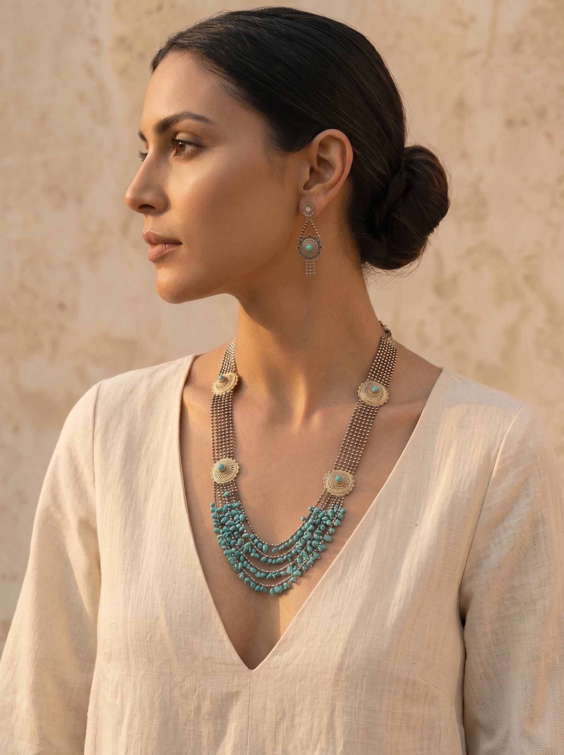 Antique silver statement piece adorned with cascading turquoise drops, paired with elegant matching earrings.