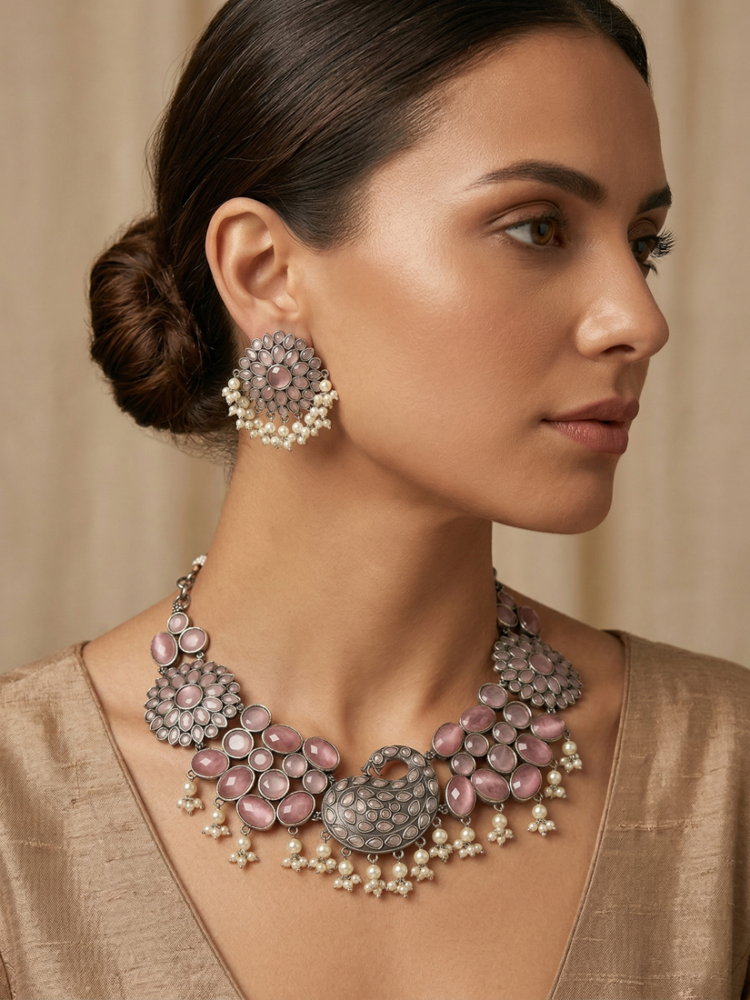Antique Stone & Agate Necklace with Pearl Dangling paired with matching earrings