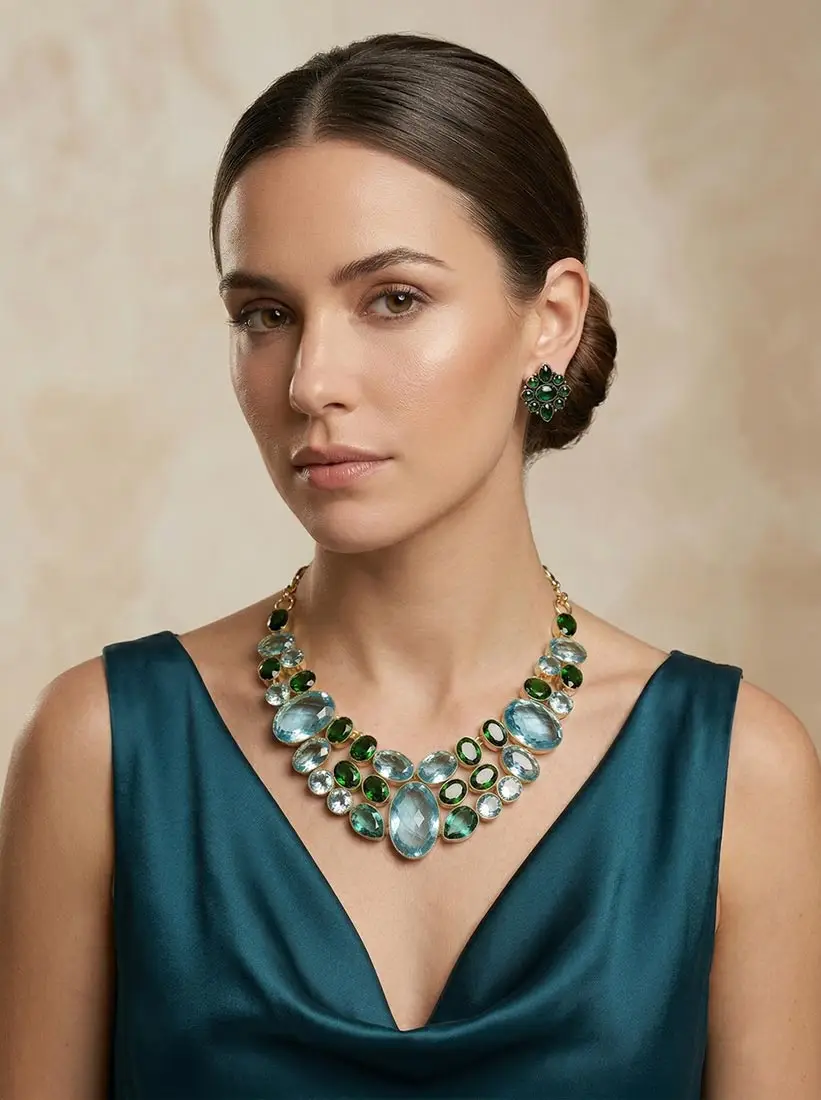 Aqua marine and green agate statement necklace set in a gold base, paired with matching stud earrings.