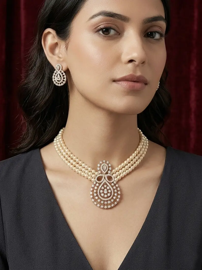 Classic triple-layer shell pearl set highlighted with a zircon stone pendant and matching earrings.