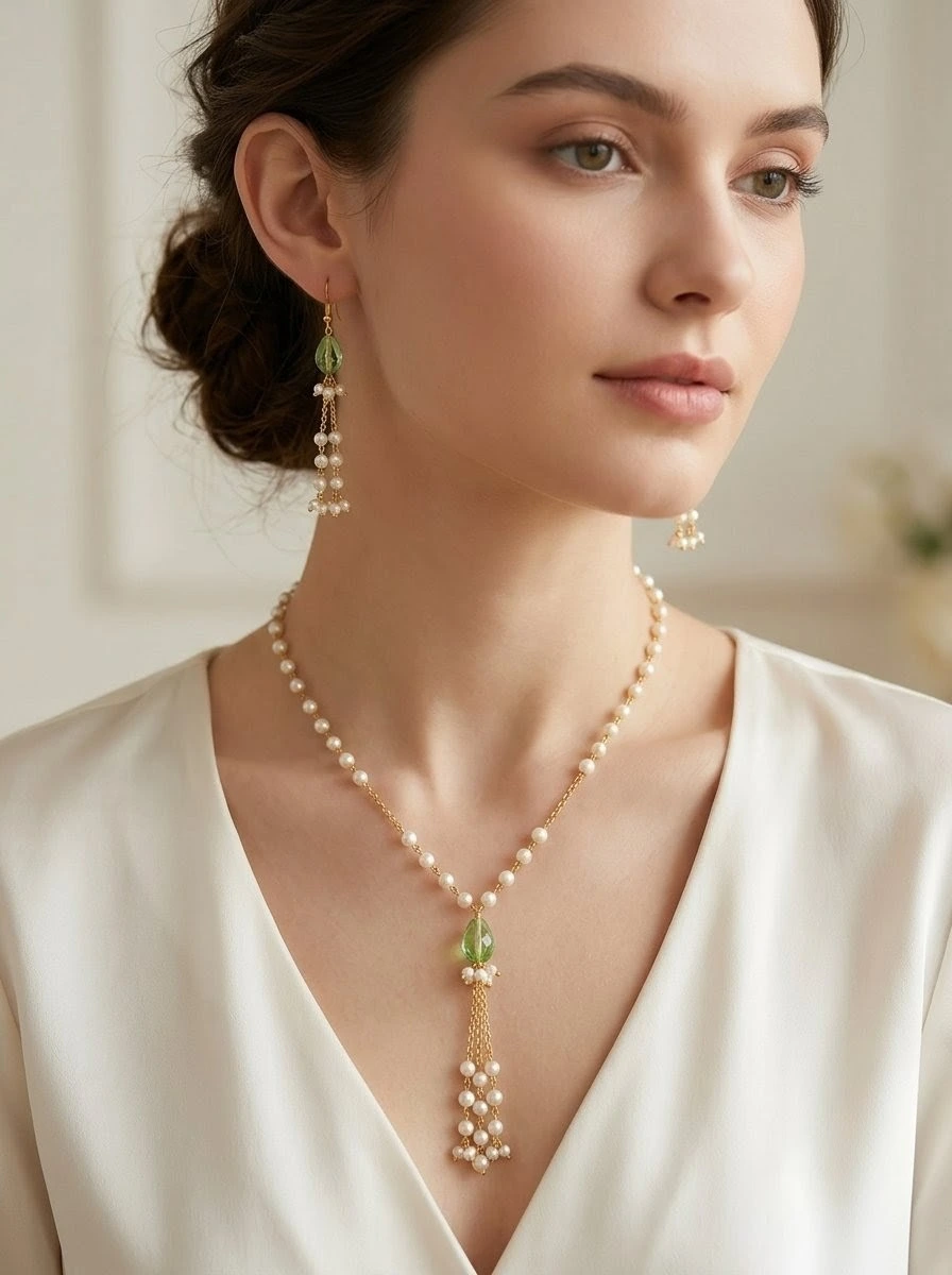 Delicate gold chain adorned with shell pearls and a light green crystal drop, paired with graceful matching earrings.