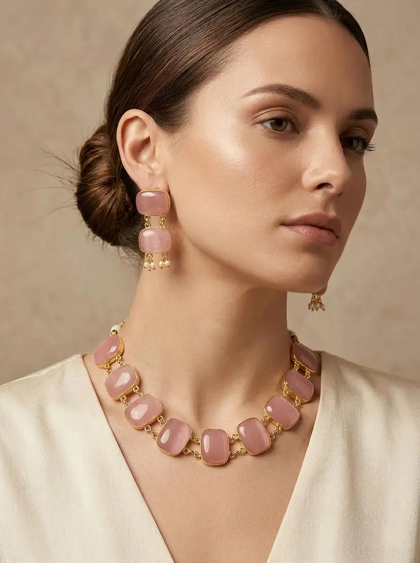 Gold necklace set featuring emerald blush pink Monalisa stones, paired with matching drop earrings.