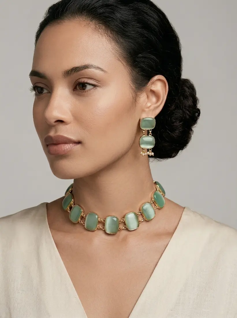 Gold necklace set featuring soft green Monalisa stones, paired with matching drop earrings.