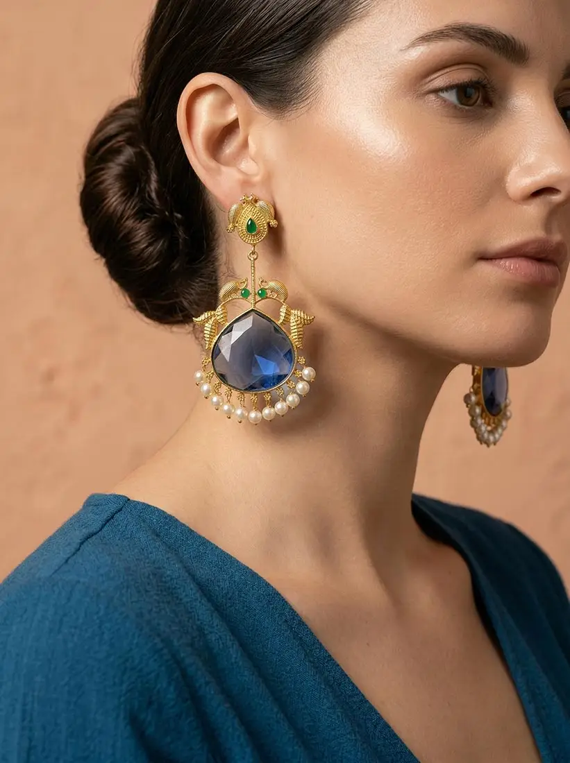 Golden peacock adorned with a striking blue agate stone with delicate pearl danglings