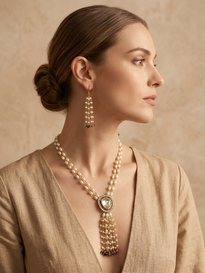 Kundan Pendant Necklace in Gold Base with Shell Pearl, Pink and Green Crystals