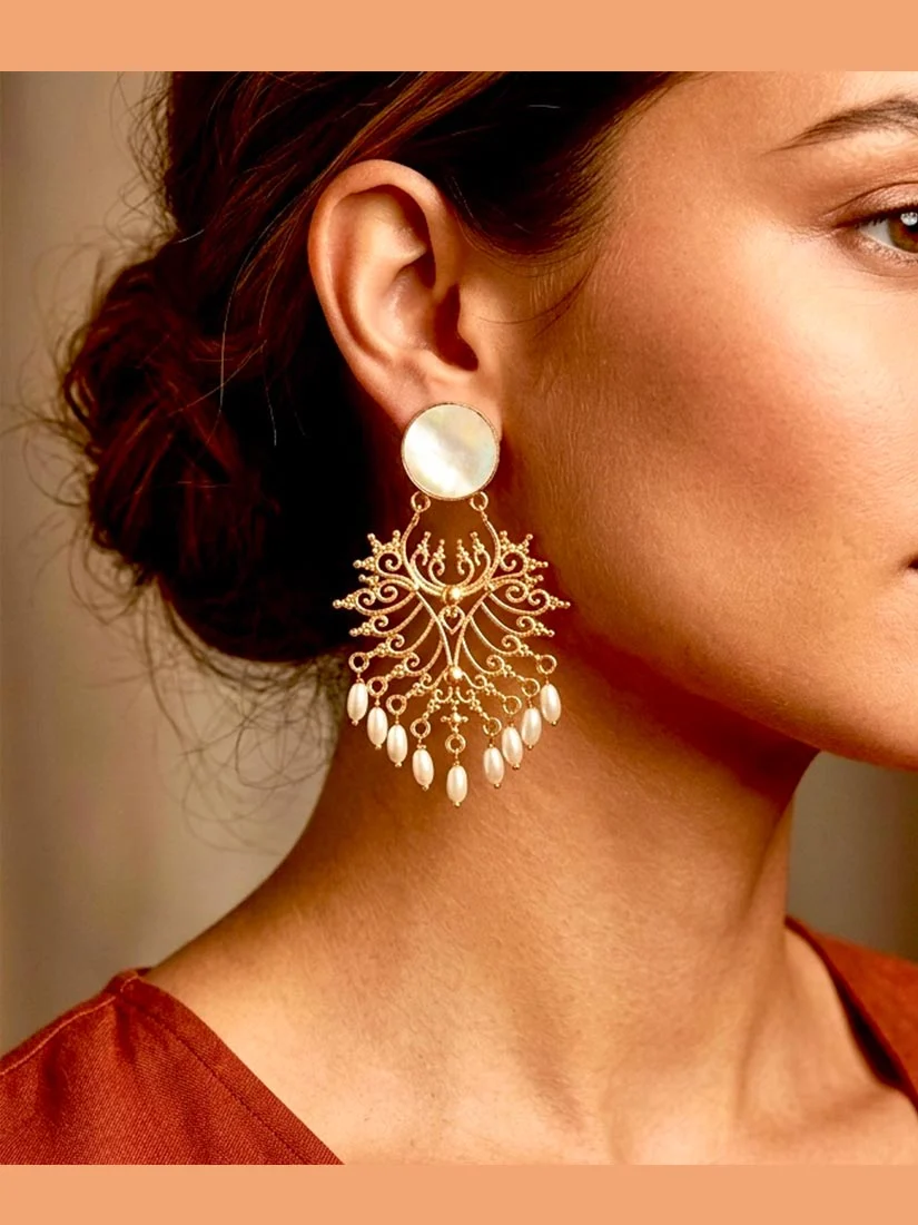 Mother of pearl stud earrings with intricate filigree work and delicate pearl drops