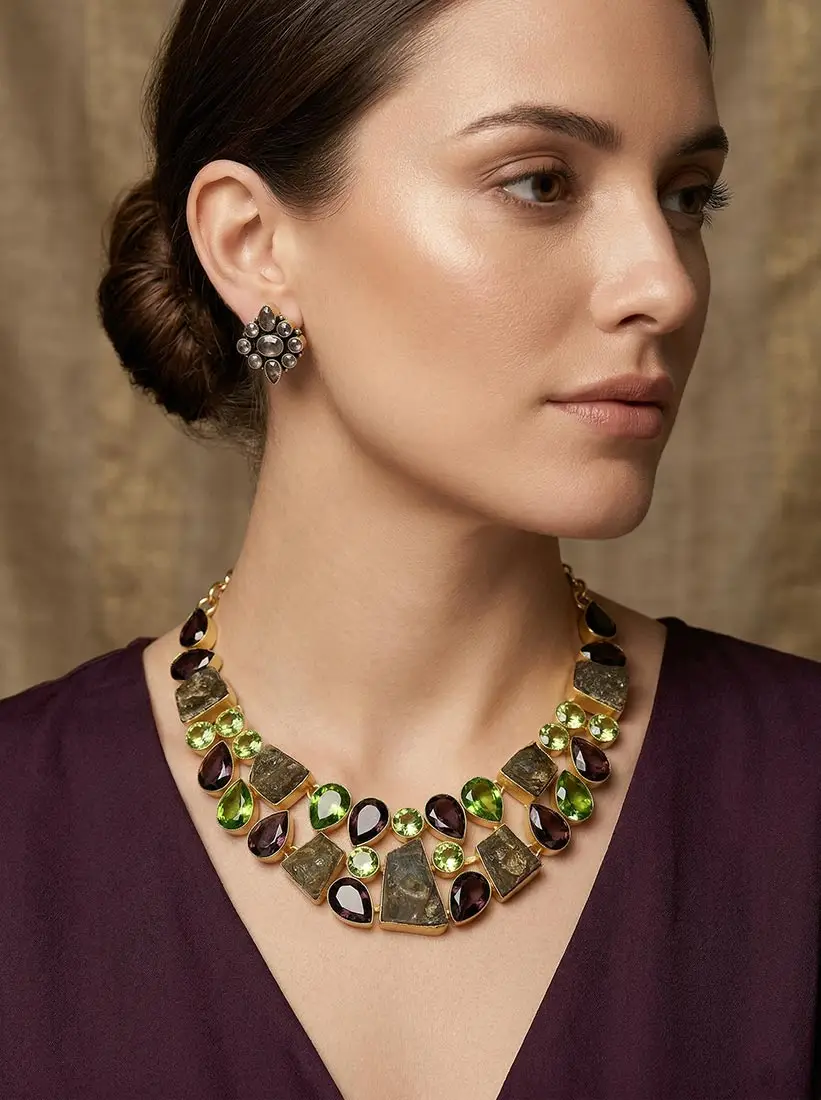 Raw garnet and green agate statement necklace set in a gold base, paired with matching stud earrings.